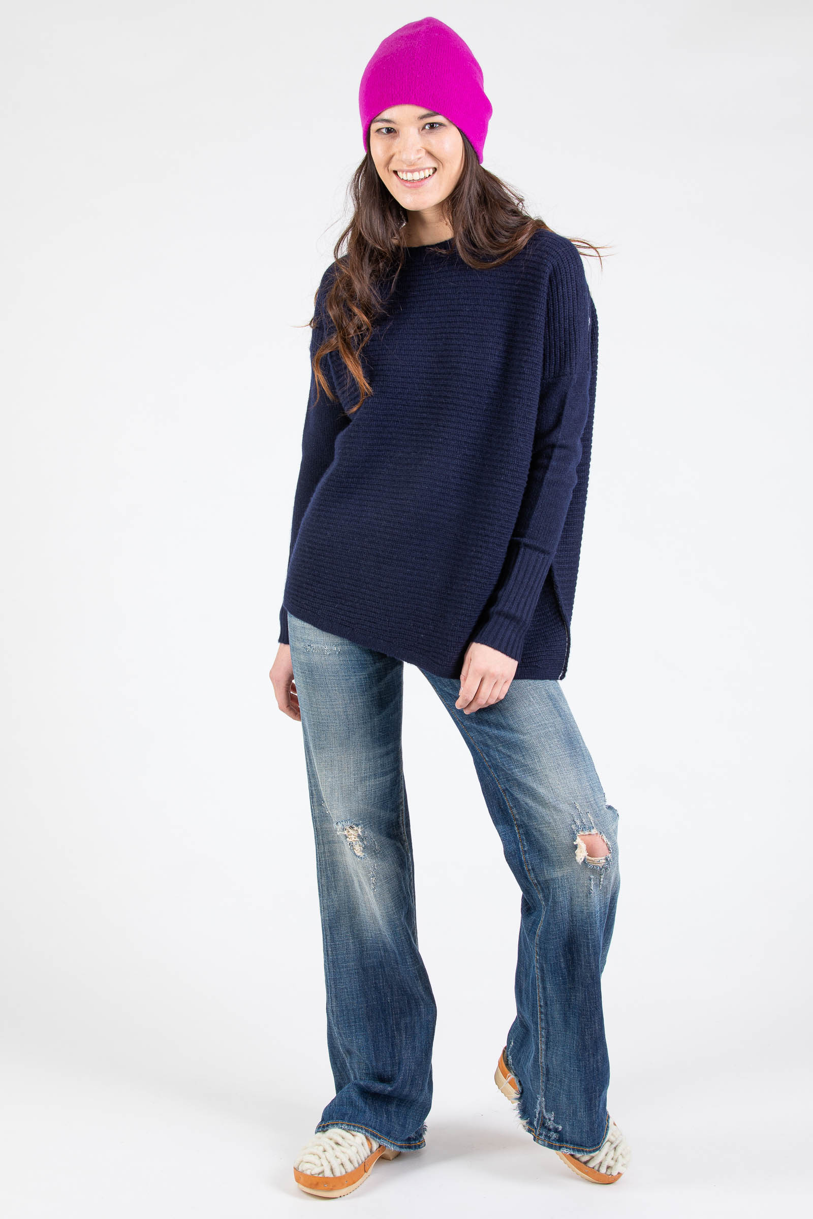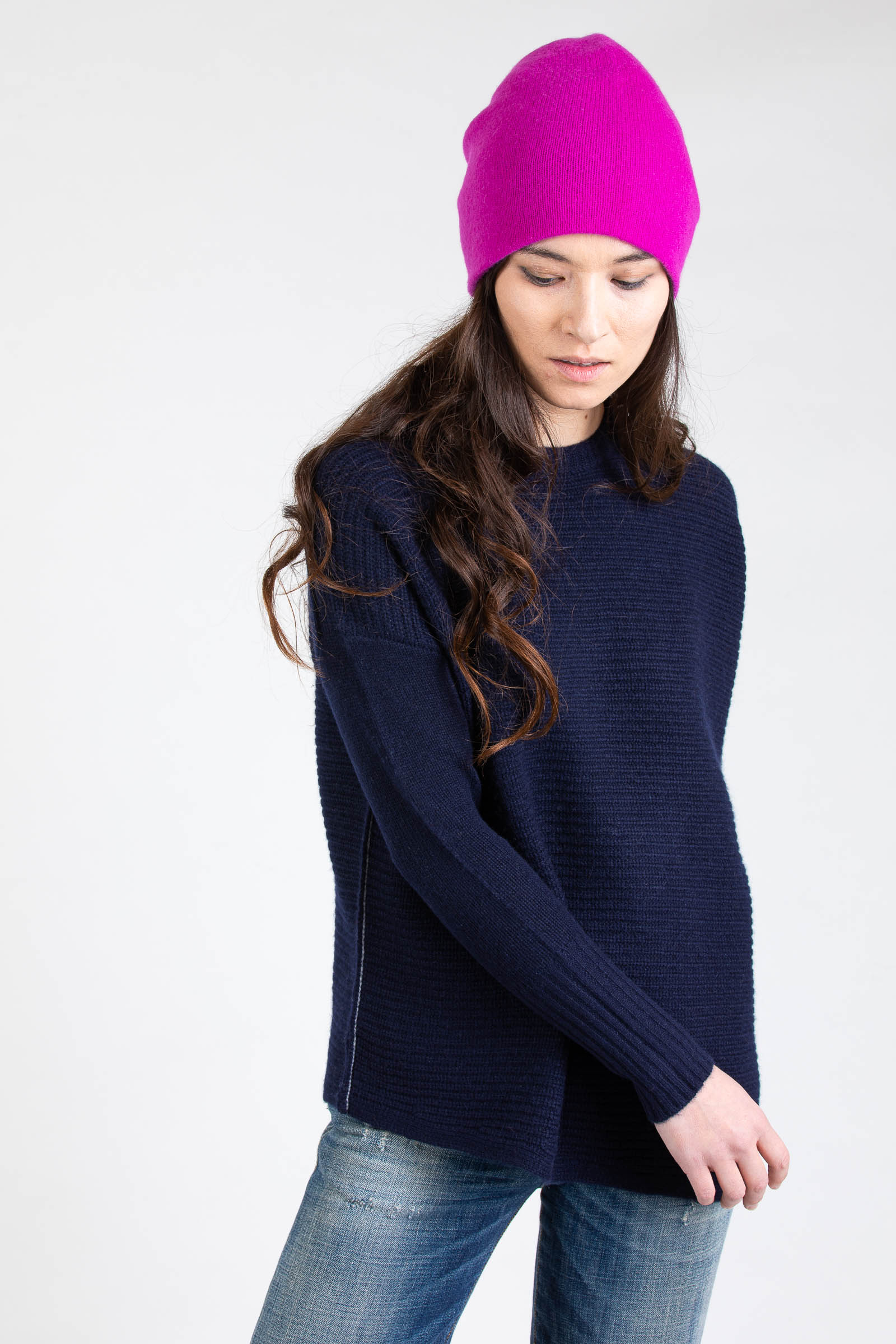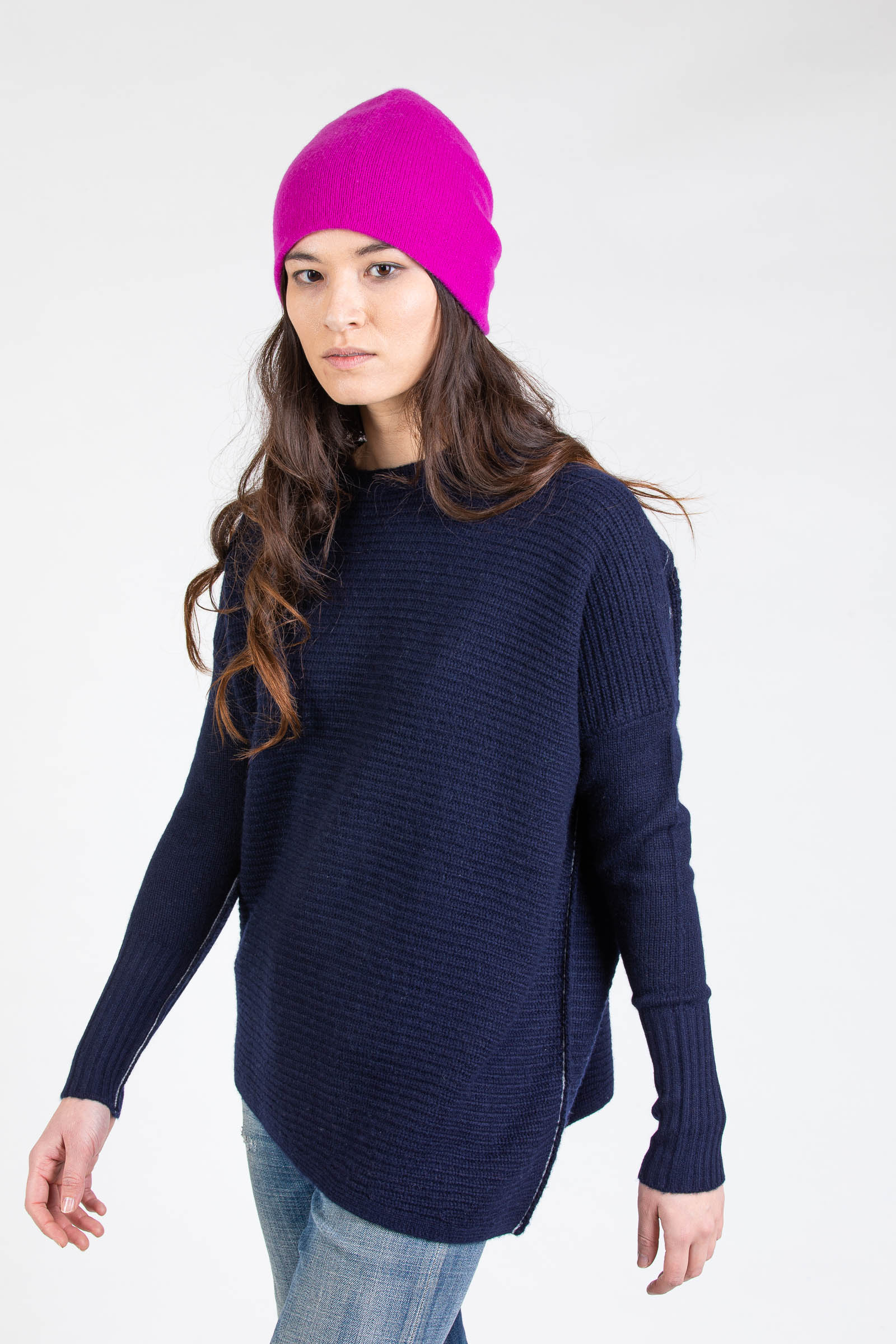 The unbeatable beauty of cashmere sweaters made with 2 ends of 2/26’s yarn knitted off gauge comes from the combination of visually beautiful three-dimensional surface textures, the luxurious drape, and ultimate comfort. Made with 100% premium Mongolian cashmere, the textured Asymmetrical Crew features body panels placed diagonally, knitted in shaker stitch, for a chic asymmetrical look.