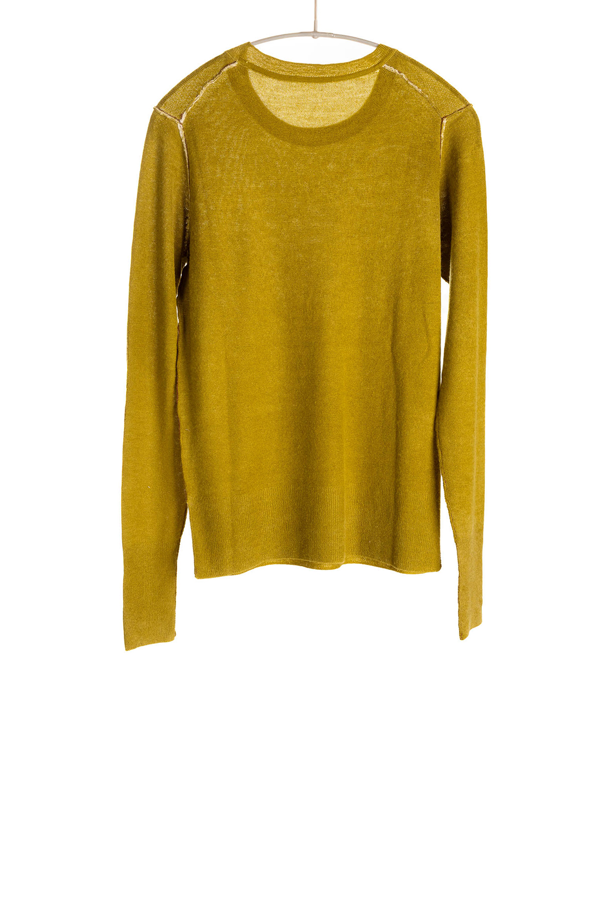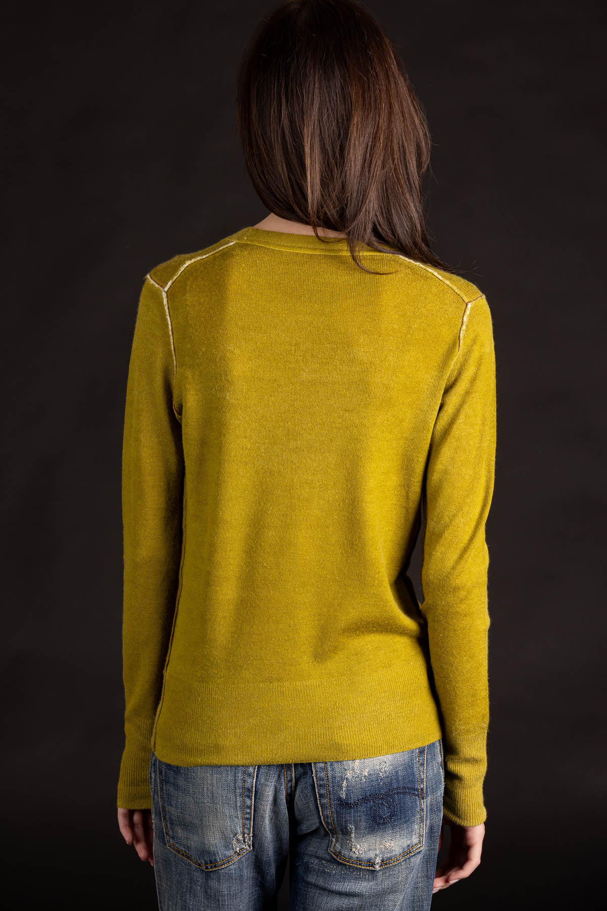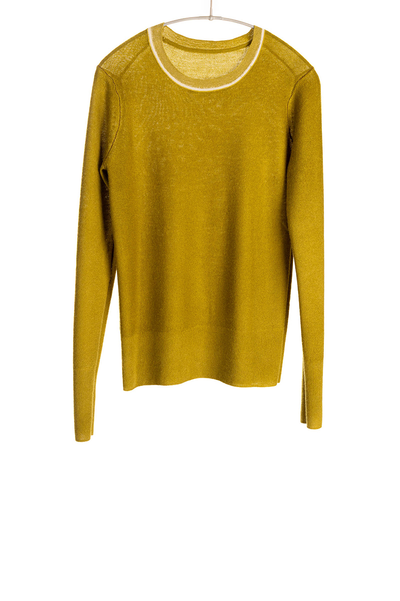 The beautiful coloration of this piece comes from the push-through printing technique. The ink is skillfully applied by hand to the inside of the finished sweater, leaving the outside seaming design lines un-dyed and creating the intriguing vintage look on the surface. The artisan handprints the sweaters one by one; in each process, print color penetrates and fades at different areas, making each sweater unique. A pop of color at the seam joins adds another layer of surprise.